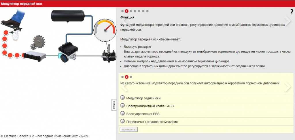 Регулировать давление в мембранных тормозных цилиндрах передней оси грузового транспорта помогает модулятор передней оси. Наши переводчики сделали доступными на русском языке обучающий модуль, который посвящён этому устройству транспортного средства.