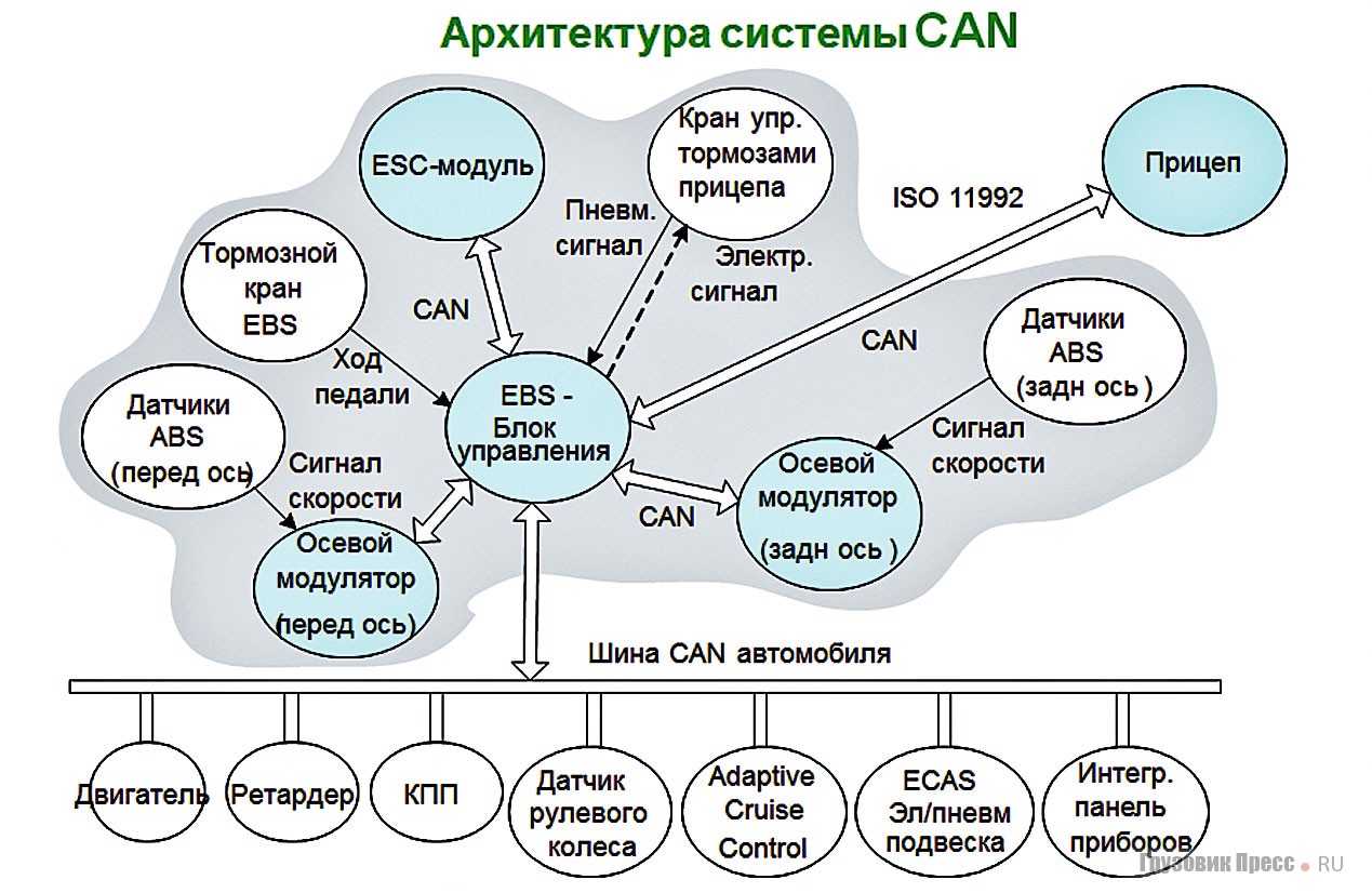 Теперь пройдёмся по характеристикам важнейших из этих компонентов. Сердце и мозг системы – электронный блок управления ECU обеспечивает приём команд водителя и руководит работой всех компонентов. Связь с прицепом обеспечивается по CAN-шине (ISO 11992) (рис. 2). Связь с другими блоками осуществляется также через CAN (SAE J 1939), а диагностика проводится через CAN OBD 2 (ISO 14229)