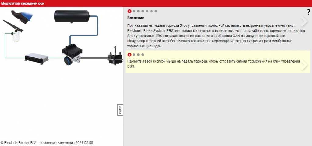 При нажатии на педаль тормоза блок управления EBS посылает сообщение через CAN-шину на модулятор передней оси. Это сообщение CAN дает команду модулятору передней оси нагнетать ответное давление (+/- 0,4 бар) в мембранных тормозных цилиндрах.
