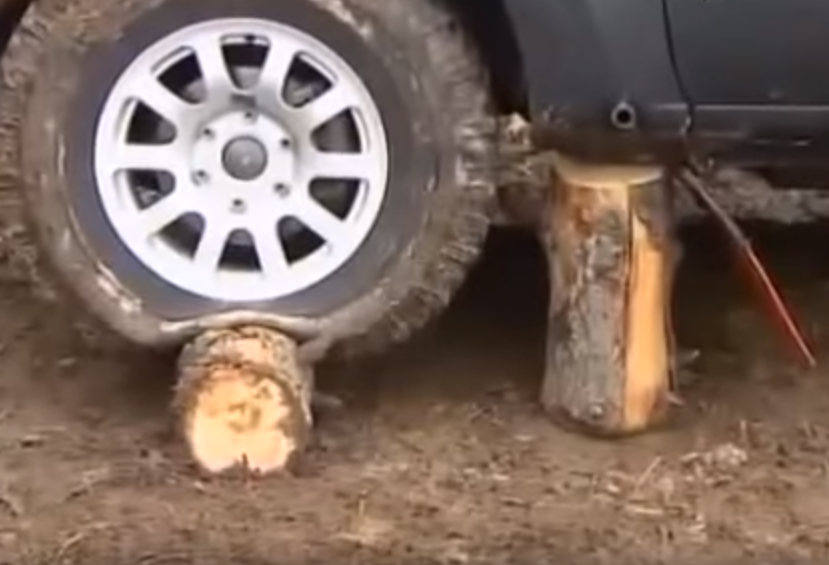 Если же не посчастливилось продырявить свое колесо где-нибудь в глухом лесу, то шансов выбраться из западни будет более чем достаточно за счет всевозможного лесного материала, а в частности бревен: