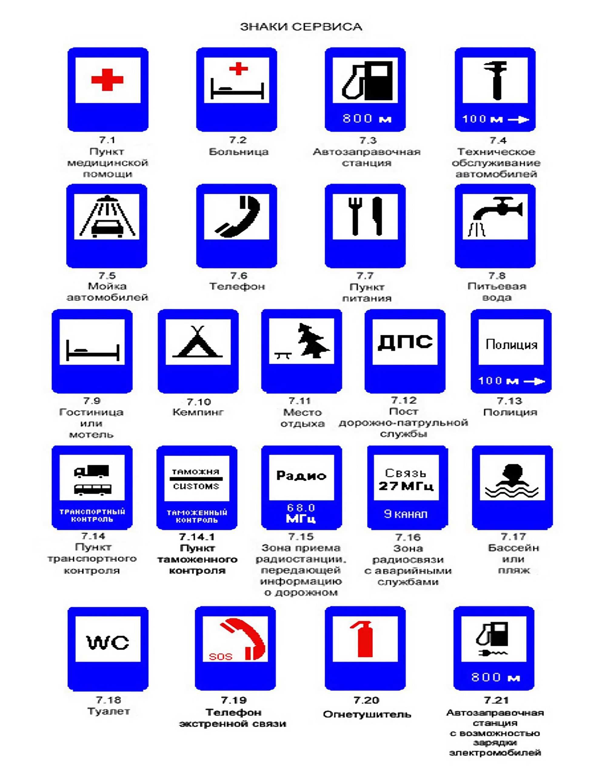 Знаки сервиса играют исключительно информационную роль и не несут предписаний для участников движения. Их функция – информирование водителей или пешеходов о расположении сервисных объектов – больниц, АЗС, телефонных аппаратов, моек, станций ТО, мест отдыха и т. д.