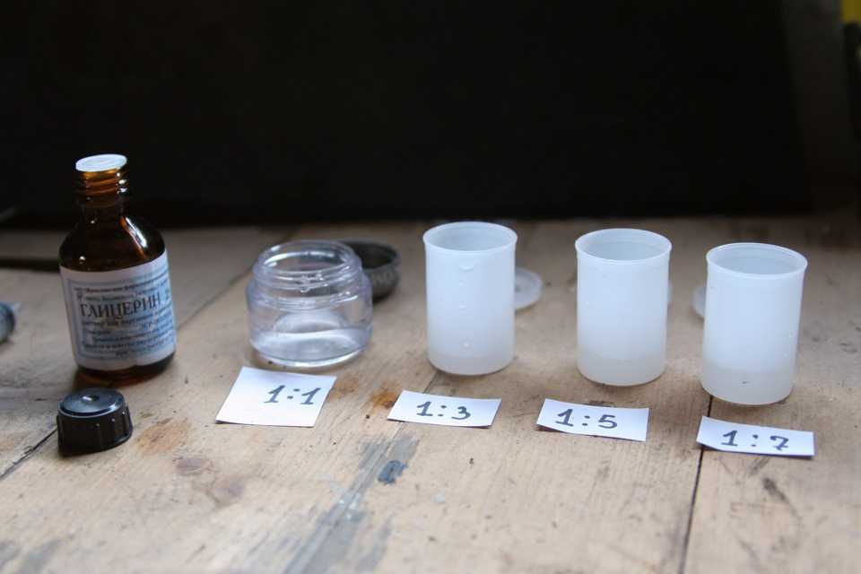 Или наоборот, чтобы увеличить количество состава, но уменьшить жирность, пропорцию меняют, к примеру 8/5 (восемь долей воды и пять долей глицерина).