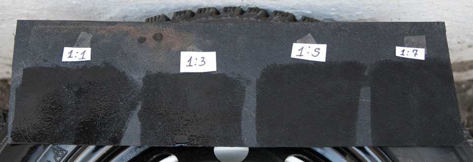 Я не претендую на «открытие америки», уже давно многие автолюбители практикуют чернение резины глицерином разбавленным водой. Вот только результат такого «чернения» меня не вдохновлял… «засаленные» колёса мне не нравятся…Решил провести тест и подобрать для себя приемлемую пропорцию разбавления.Далее смотрим фото: