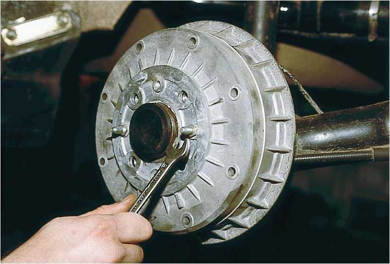 При подготовке к этим работам также нужно выбрать ровную поверхность. Фиксируем передние колеса упорами. Не выжимая ручной тормоз, включаем первую передачу. Затем ослабляем болты, крепящие колесо к ступице. Домкратом поднимаем одну сторону. Выставляем под нее опорную подставку. После чего выкручиваем болты и снимаем колесо. Теперь можно приступать к разборке механизма:
