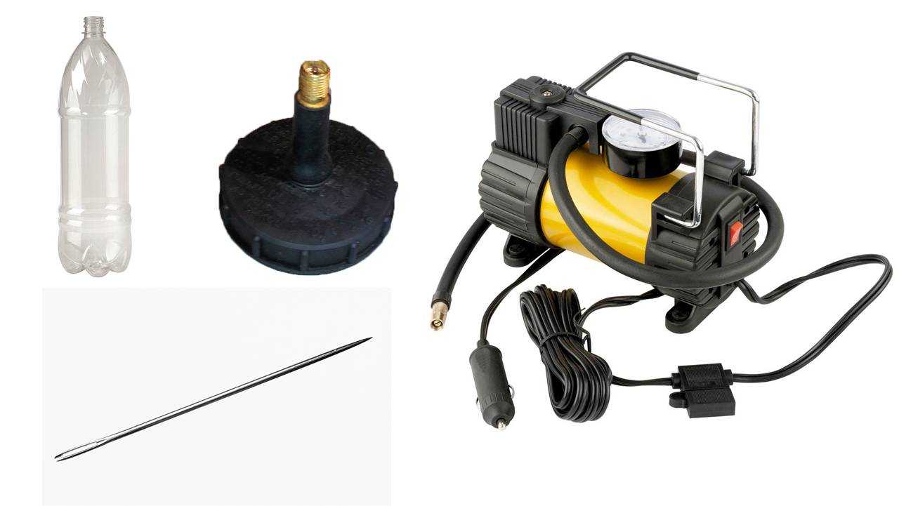 Пластиковую емкость лучше брать двухлитровую, пробка у нее должна быть стандартная. Также потребуется пробка для бутылки с золотником. Можно сделать самому, а можно пойти и купить за 20 рублей. Также приготовьте швейную иголку и компрессор. Например, на 45 литров.