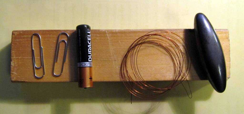 Над батарейкой поместите кольцо из проволоки. Свободные края проденьте в петельки на скрепках. Старайтесь не сгибать проволоку. Если это произошло, то обязательно выровняйте ее.