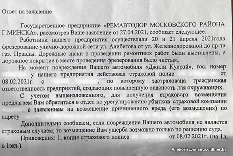 Еще один хороший совет — все общение с официальными органами и организациями вести в письменном виде. Алексей написал заявление и получил на него письменный ответ. В нем два важных момента. Во-первых, Ремавтодор подтвердил, что 20 и 21 апреля проводилось фрезерование улично-дорожной сети улицы Алибегова от улицы Железнодорожной до проспекта Газеты «Правда». «Дорожные знаки о проведении работ были выставлены, а дорожное покрытие в месте проведения фрезерования было чистым», — утверждают в организации.