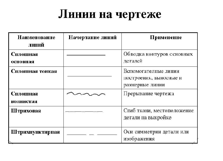 Шесть типов линий применяются на всем чертеже. Самые используемые носят названия «сплошная тонкая» и «сплошная толстая». Все линии перехода, видимые контурные линии обозначают толстой сплошной, а тонкой обозначается штриховка, выноски, контур наложенного сечения, надписи, изображение пограничных деталей, следы плоскостей, характерные точки. На штампах также используются основные сплошные толстые линии.