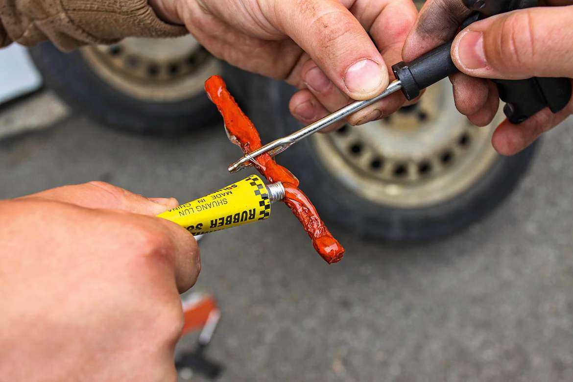 Надо сказать, что вдавливание наконечника со жгутом даже в прочищенное и расширенное отверстие требует немалой физической силы. Причем это нужно успеть сделать на еще не полностью спущенной шине, иначе она будет продавливаться под нажимом.