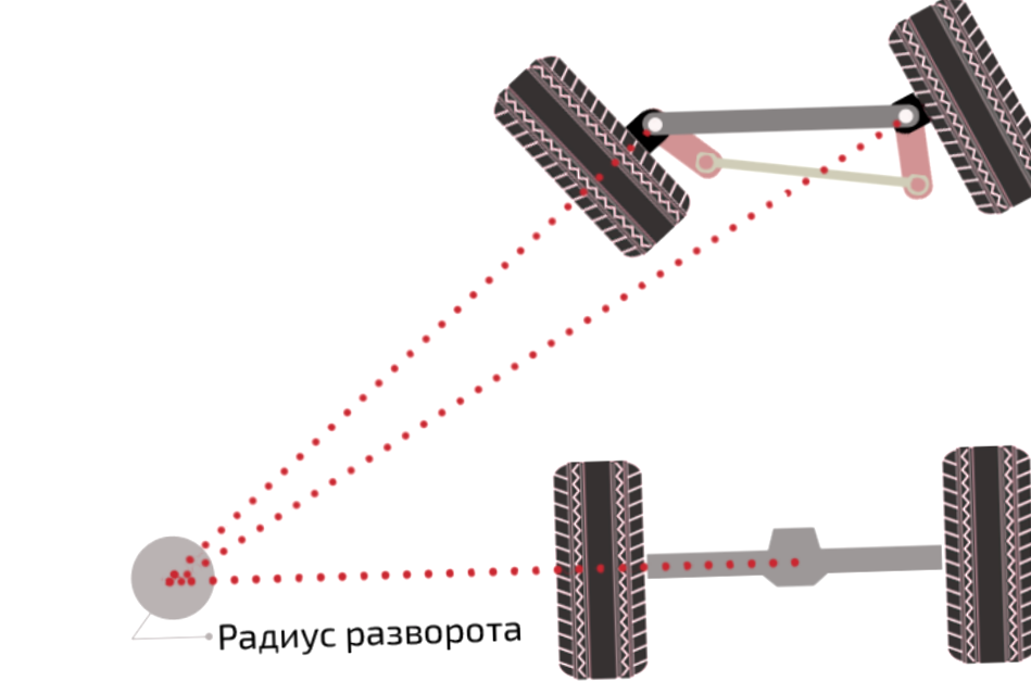 Таким образом мы видим, что при повороте колёс они «уходят» на разные углы. Угол внутреннего колеса будет больше, а у наружного меньше. Центры окружностей у колёс совпадают, а по радиусу окружности наружного колеса мы определяем радиус разворота автомобиля с поправкой на ширину шин.