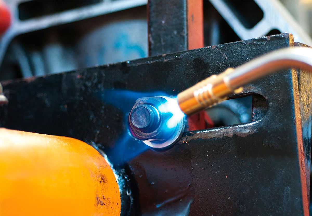 Под воздействием высокой температуры металл расширяется, поэтому, чтобы выкрутить болт, разогревать нужно гайку или деталь, в которую вкручен метиз, а если это не помогает, то и сам крепежный элемент, так как колебание размеров поможет разрушить ржавчину. Нагревать можно с помощью инструмента, такого как газовая горелка, паяльник или даже при помощи зажигалки.
