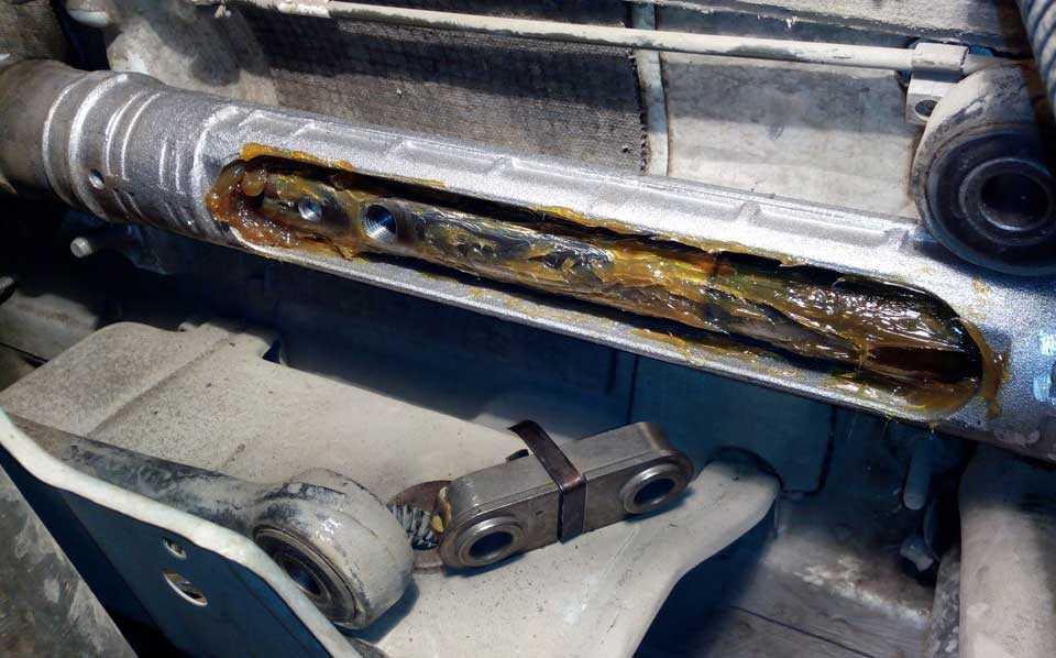 - Обследовать механизм рулевой рейки на наличие масляных подтеков, незажатых креплений, подергать тяги для определения люфтов.