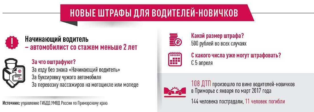 Ранее закон не предусматривал наказание, если на машине новичка отсутствовал знак «Неопытный водитель». Но с апреля 2017 года было принято постановление, которое на законодательном уровне предусматривает штраф в размере 500 рублей. В 2018 году размер штрафа сохранился на прежнем уровне.