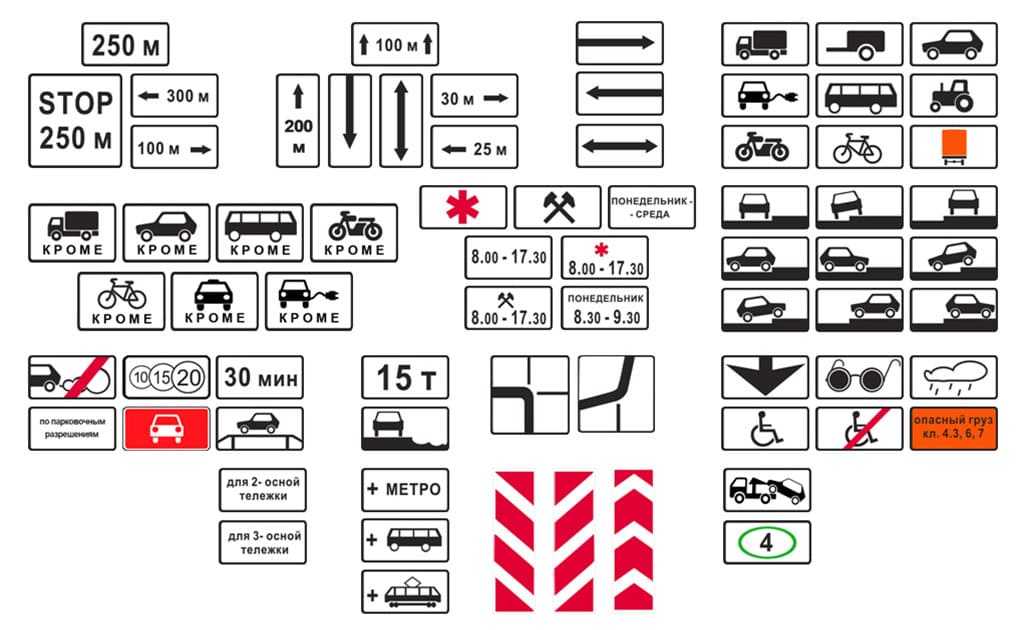 К этой группе относятся уточняющие таблички, предназначенные для расширения (уточнения) действия некоторых дорожных знаков.