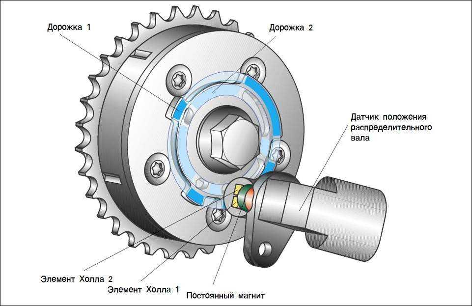 Работает с магнитом, установленным на маховике. Всякий раз, когда он проходит мимо сенсора, в ДПКВ возбуждается постоянный ток. Это фиксируется синхронизирующим диском, и информация передается в блок управления двигателем.