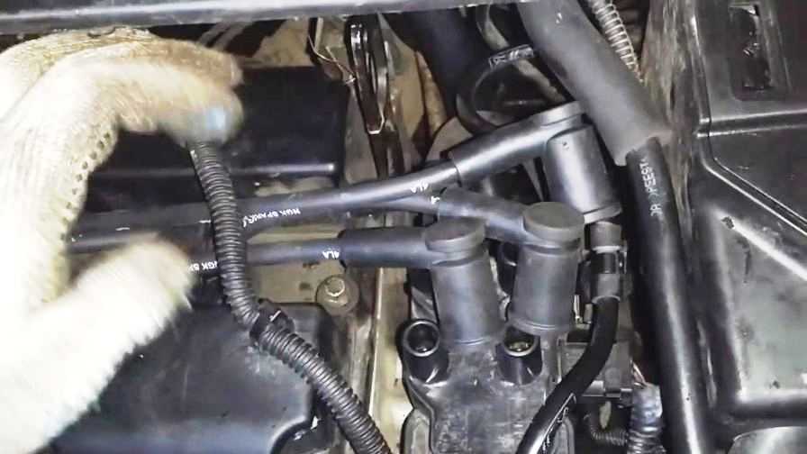 - Как мы уже сказали, все действия по замене должны производиться при отключенном напряжении в электросети. Поэтому в первую очередь отключите аккумулятор, после чего приподнимите теплозащитный чехол, расположенный на жгуте устройства.