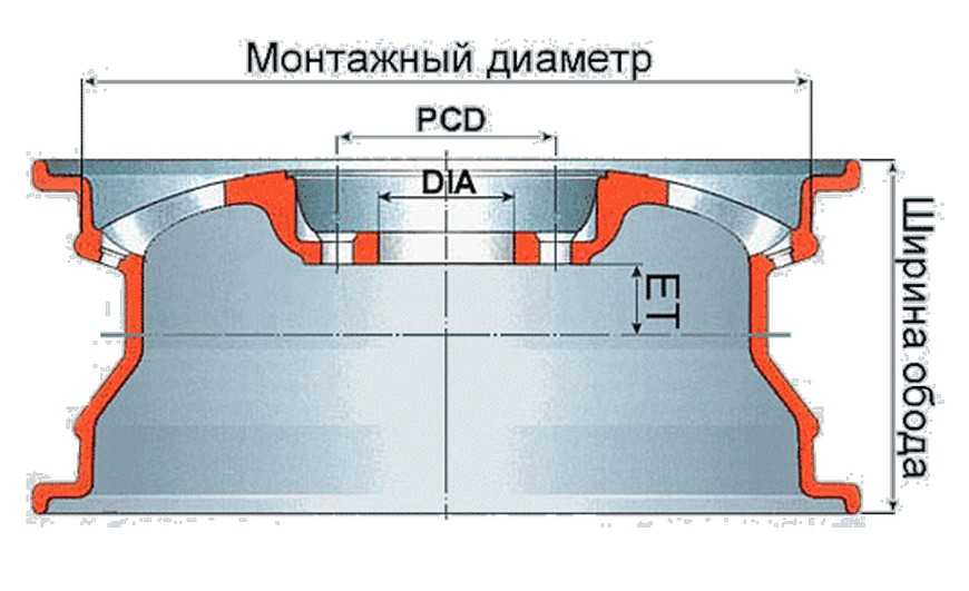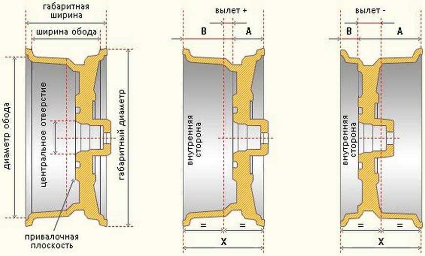 Второй важнейший параметр в маркировке дисков автомобиля — вылет (ET). Это расстояние от точки, где крепится диск к ступице, до проекции привалочной плоскости, измеряется в миллиметрах. На что указывает колесный вылет: