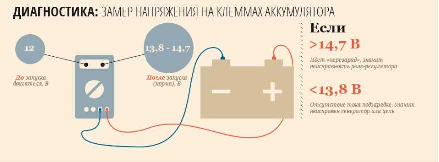 - Спустя 10 минут работы мотора измеряем напряжение в цепи. Оно должно быть равно 14.0 – 16.0 В. Это стандартные допуски, указанные в руководстве по эксплуатации. Нарушение диапазона указывает на поломку, неисправность генератора.