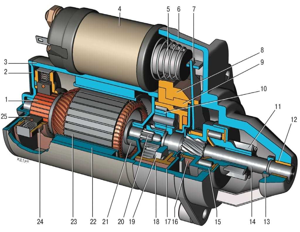 1. Коллектор; 2. Задняя часть; 3. Корпус; 4. Втягивающее; 5. Сердечник; 6. Возвратная пружина; 7. Рычаг; 8,9. Резиновая прокладка; 10. Шестерня редуктора; 11. Шестерня бендикса; 12. Втулка; 13. Стопор; 14. Вал; 15. Обгонная муфта; 16. Червяк; 17. Упор; 18. Корпус редуктора; 19. Внутренняя шестерня; 20. Средняя шестерня; 21. Опора вала; 22. Магнит; 23. Якорь; 24. Щеткодержатель; 25. Щетка;