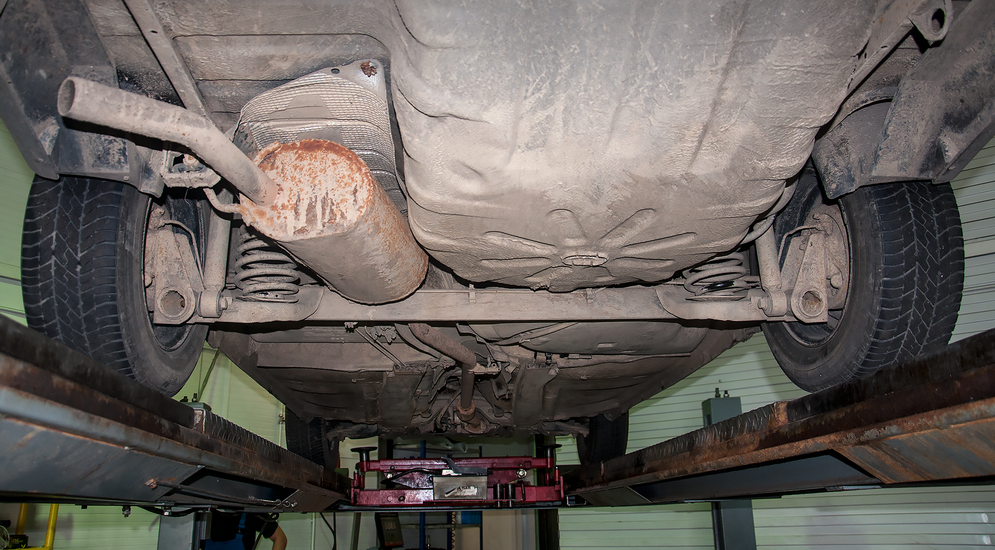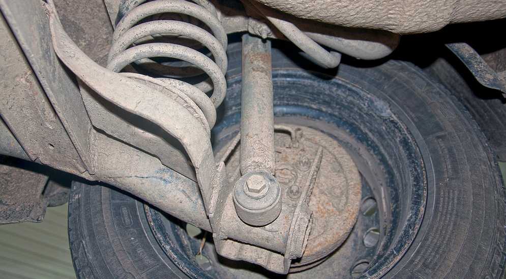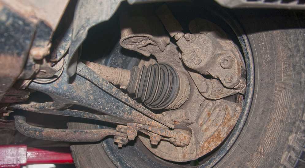 - Сторона, где проводится замена — подвешивается с помощью домкрата, предварительно сорвав болты крепления колеса.