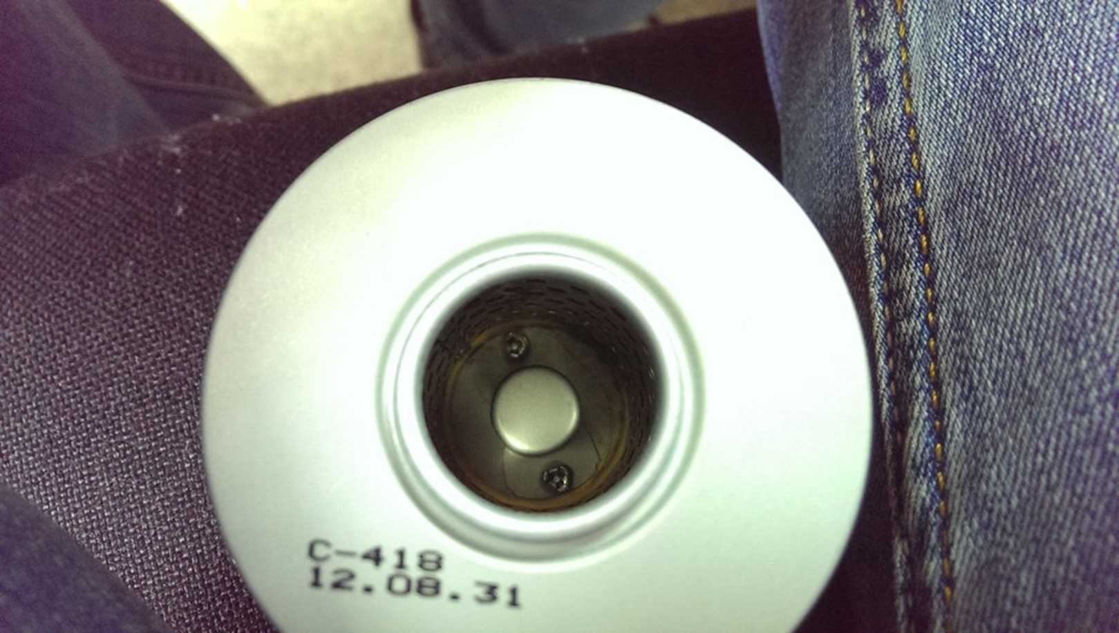Фильтрующий элемент оригинала скреплен металлической скобой. У подделки возможно склеивание герметиком либо сквозное отверстие.