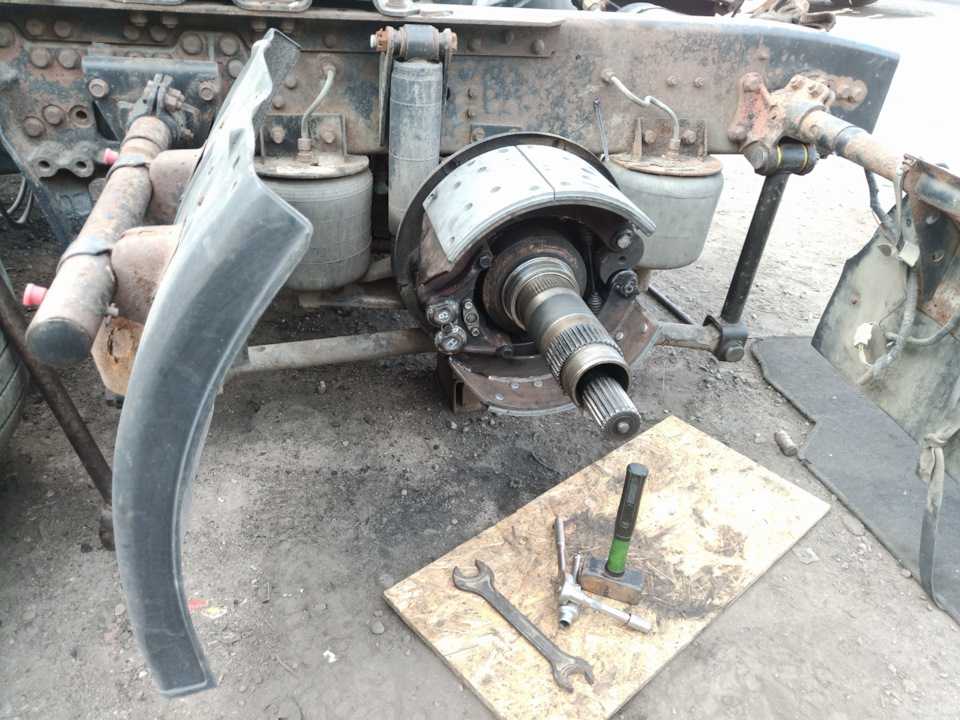 Стало понятно, что с наскоку узел не победить и надо точить специальную выколотку с более качественного металла (хотя бы с клапана). Тут я осознал, что на полуприцепе 6 колес и, видимо, с каждым придется повозиться. Сразу вспомнилось крепление колодок оси BPW, там то все устроено куда как проще. Достаточно было снять пружины у мертвых опор и можно снимать колодки.