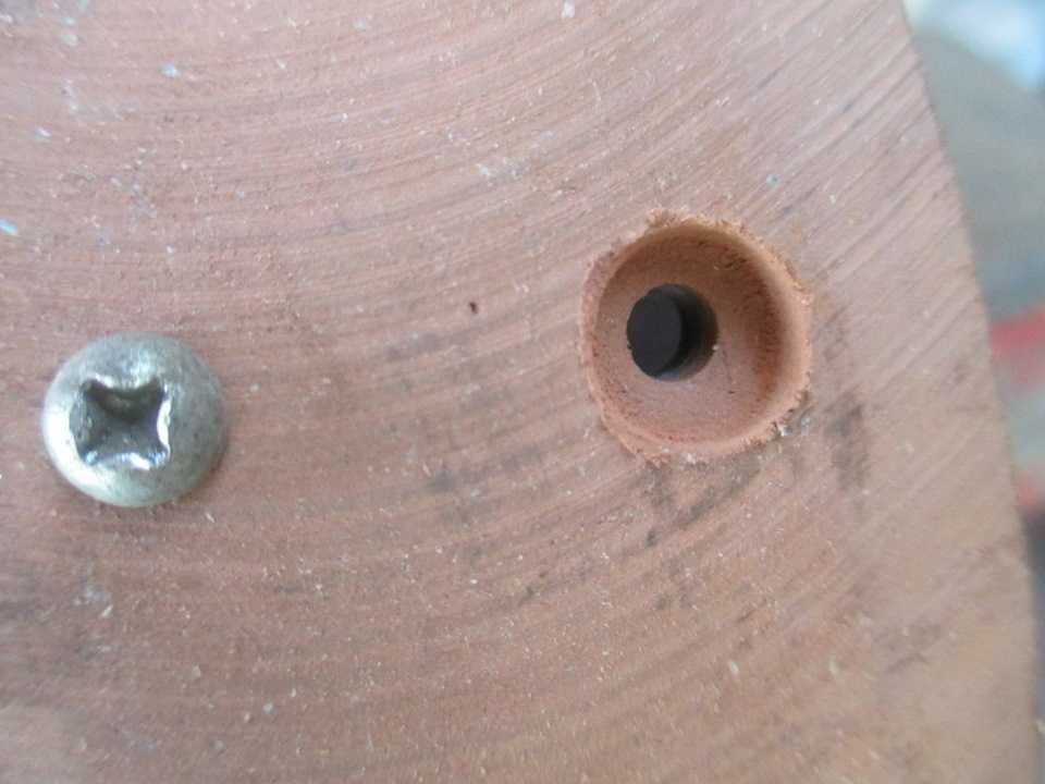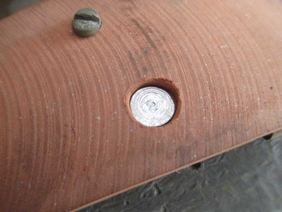 Под эти выступы надо сделать небольшие углубления во фрикционном материале. Для этих целей с обратной стороны оправки я проделал два отверстия. Вот их видно на фотке: