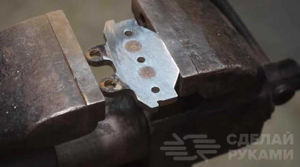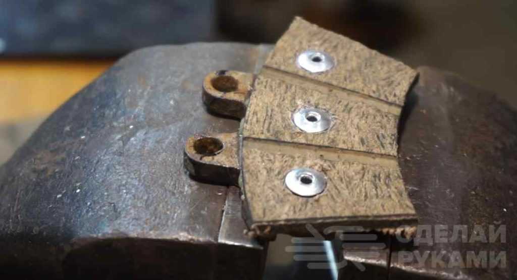 Для этого необходимо выбрать диаметр сверла. Когда у заклепки он равняется 5 миллиметрам, то нужно взять 5.3-5.5 миллиметров, если 8 миллиметров, то 8.3-8.5 миллиметров соответственно. Зафиксировать накладку на колодке можно с помощью особых стяжек и просверлив отверстия.