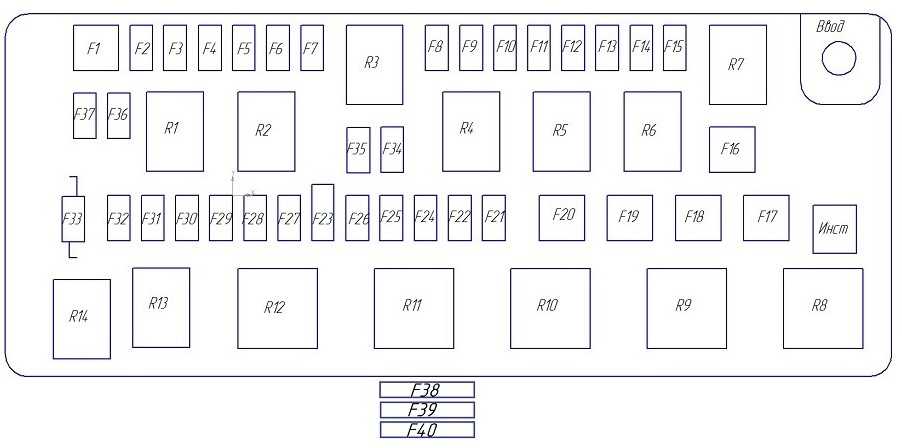 Под крышкой находятся плавкие вставки и реле, предназначение которых обозначено в таблице.