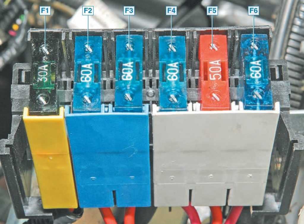 На плюсовой клемме аккумуляторной батареи находится блок силовых предохранителей выполненный в виде плавких вставок высокой мощности.