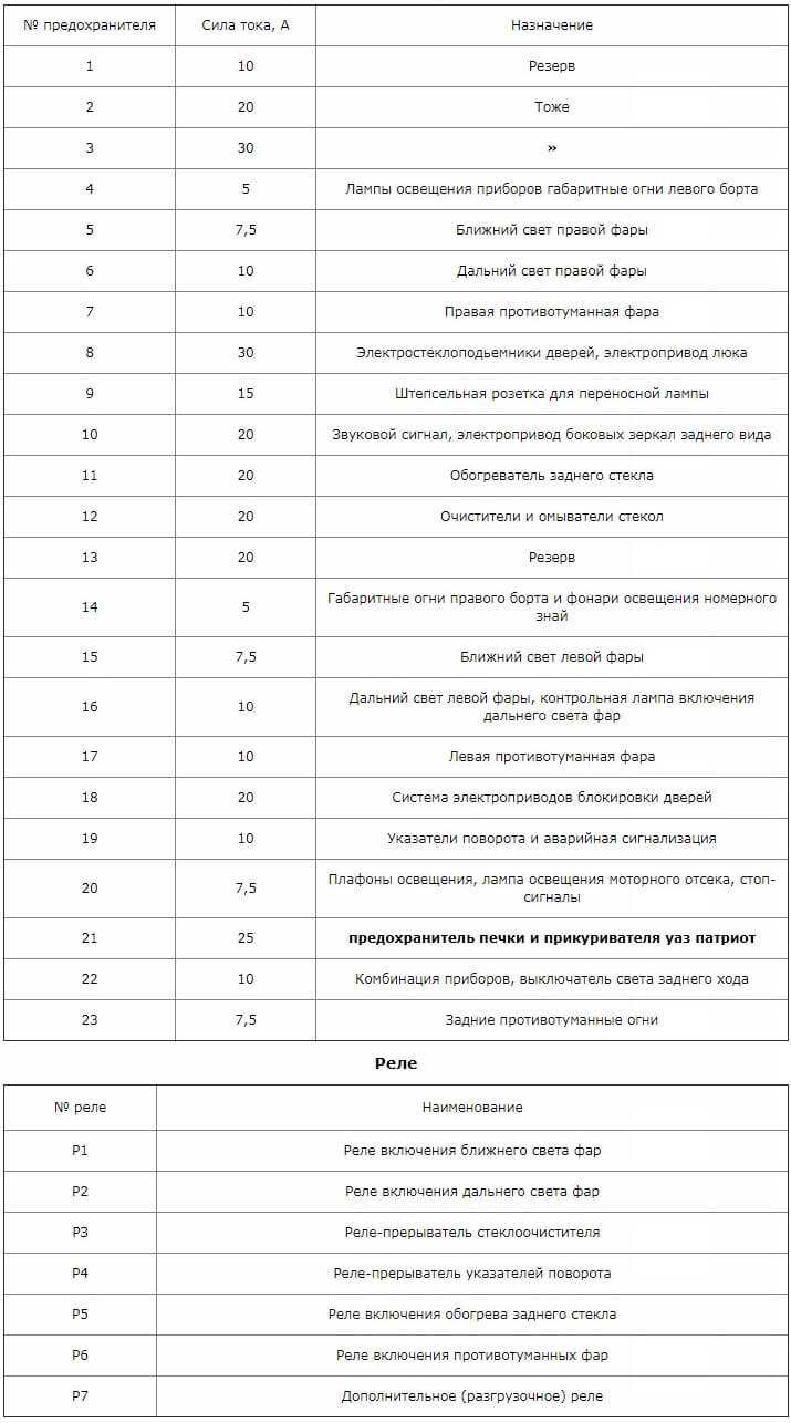 Для автомобиля УАЗ Патриот, чтобы хорошо разобраться с назначением того или иного предохранителя, ниже приведены схемы. Реле также пронумерованы, в таблице дается их расшифровка. На УАЗ Патирот заводом, начиная с первых годов выпуска, неоднократно проводились эксперименты, после которых внешний вид монтажного блока и расположение предохранителей в нем менялись кардинально.