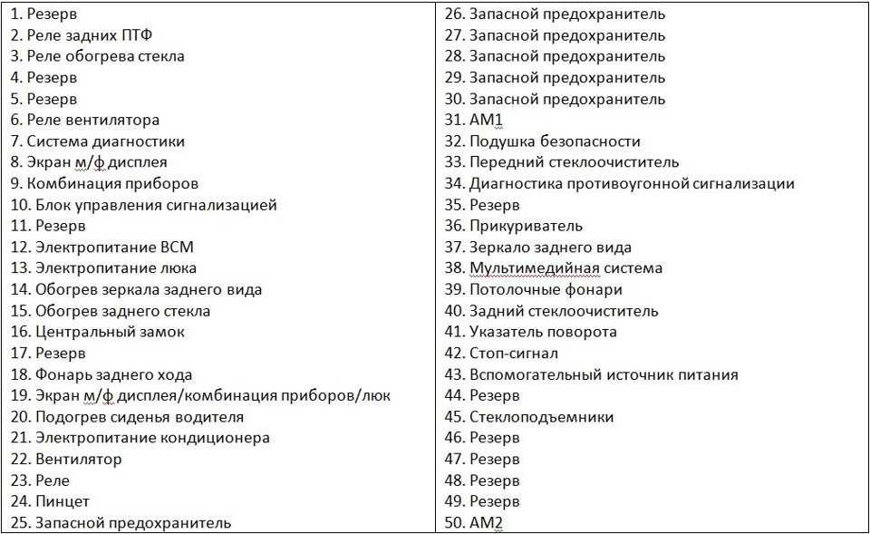 На внутреннюю сторону декоративной крышки нанесена схема расположения и назначение предохранителей.