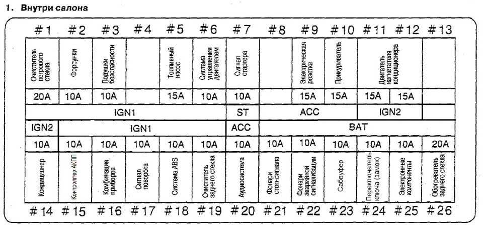 НАЗНАЧЕНИЕ ПРЕДОХРАНИТЕЛЕЙ В САЛОНЕ НИССАН АЛЬМЕРА КЛАССИК