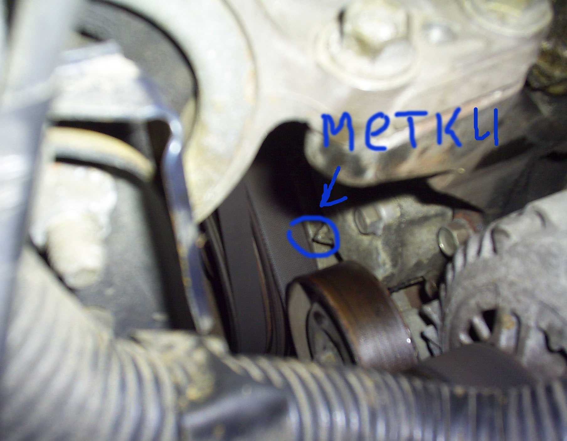 Натяжной ролик поворачивают до совпадения меток на его корпусе, фиксируют его в таком положении прутком или сверлом подходящего размера, снимают зубчатый ремень.