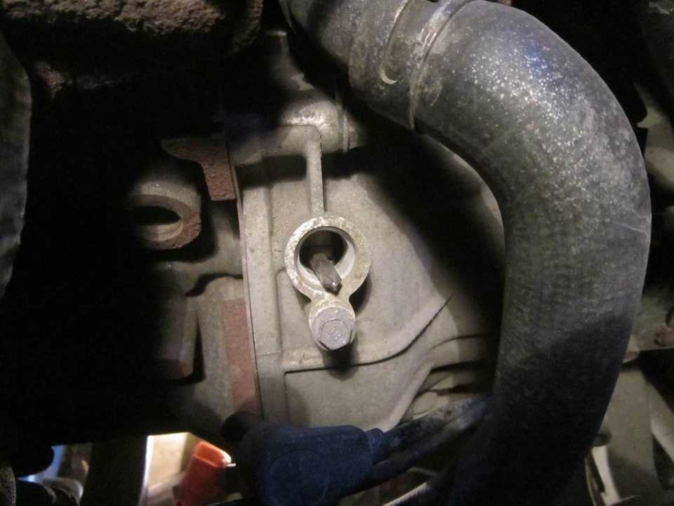 Теперь «книжка» предлагает зафиксировать маховик с помощью отвертки, вставленной в некое отверстие в колоколе сцепления. Отверстие есть, а вот зубцов маховика там почти не видно, да и держать там отвертку у меня некому. Откручиваю датчик положения КВ и засовываю туда битку от отвертки. Её шестигранник вполне попадает между зубьями и держать ничего не надо.
