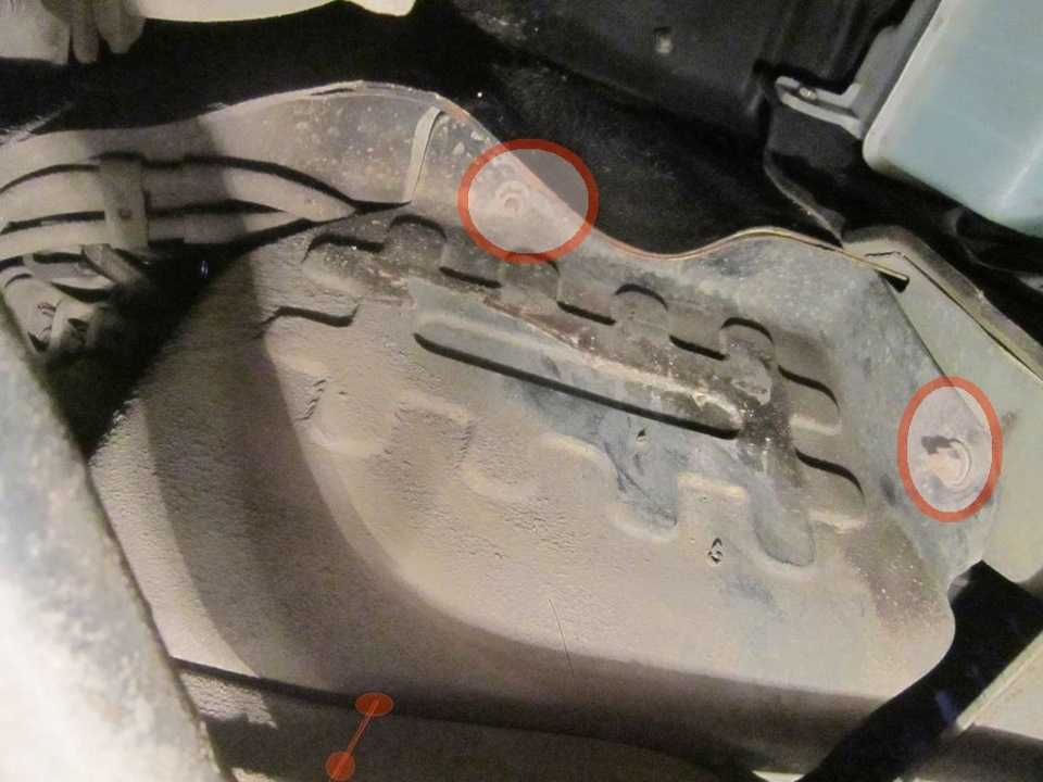 Для доступа к нижней части двигателя нужно вывесить и снять правое переднее колесо. За ним кроется защитный кожух, его тоже нужно снять. Крепеж генератора часто закисает, поэтому рекомендую для ослабления ремня отпустить нижний болт крепления генератора.