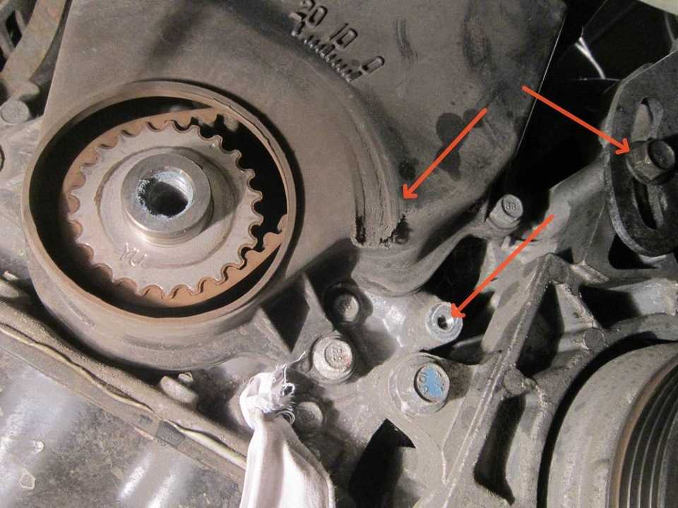 Защитная крышка сальника коленвала также имеет полученную при литье метку в виде стрелки. Вал вместе со шкивом вращают до тех пор, пока метка на зубе не будет расположена строго напротив метки на крышке сальника. Эту операцию следует выполнять при снятом ремне в приводе механизма ГРМ, чтобы не произошла встреча поршней с клапанами. Если имеются следы протечек моторного масла на крышке сальника, его следует заменить, иначе смазка ускорит выход приводного ремня из строя.