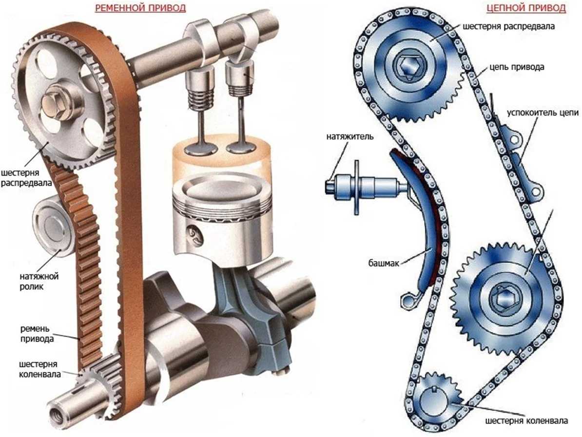 Кроме того, ремень выполняет функцию защиты двигателя от возникновения серьезных неполадок. Классический зубчатый ремень (равно как и цепь ГРМ) контролирует синхронность функционирования клапанов и поршней на одной частоте. Ремень служит своеобразной преградой от их касания, а в случае выхода из строя (к примеру, изношенный ремень попросту лопается, а цепь теряет целостность), то поршень с огромной силой бьет по открытому клапану. В мгновение это приводит к деформации клапана, выхода из строя всего двигателя (как говорят автомобилисты – двигатель «клинит»), и здесь уже необходим капитальный ремонт всего силового агрегата авто.