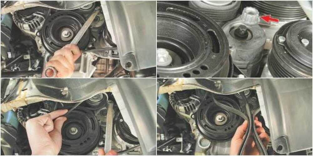 - ставить новый ремень нужно в порядке, обратном снятию.