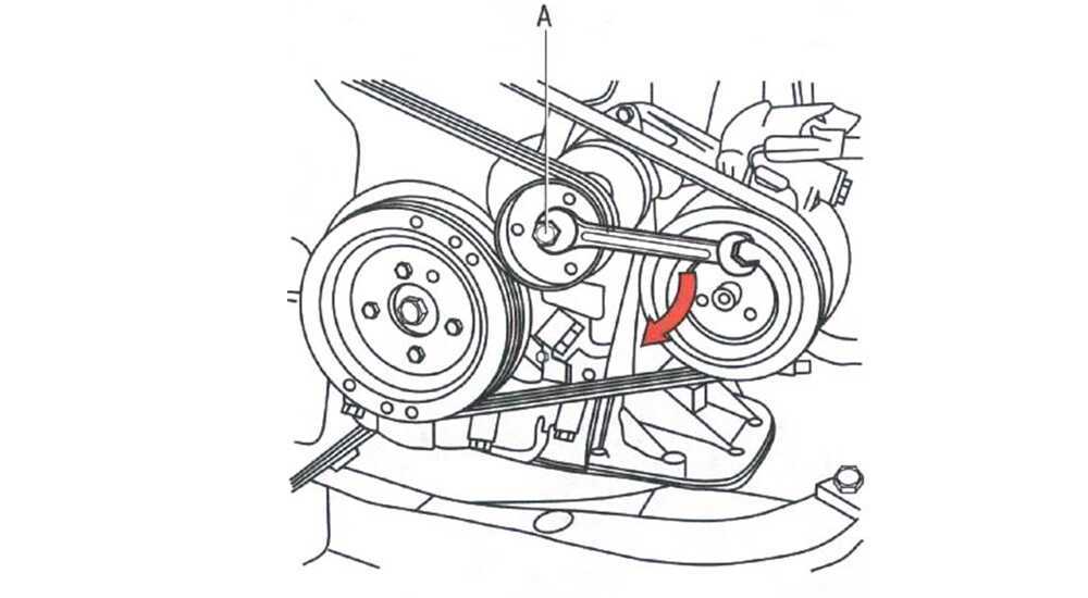 - проворачиваем центральный болт натяжителя против часовой стрелки, добиваясь ослабления натяжения приводного поликлинового ремня;