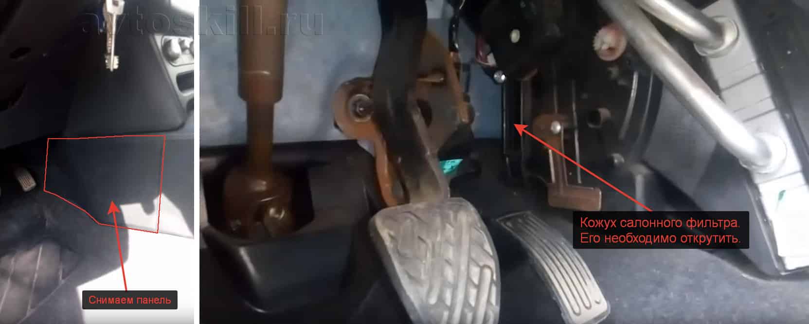 Далее возможны варианты. На некоторых машинах предусмотрены специальный люк или съёмная панель, которые необходимо открыть или демонтировать для того, чтобы получить доступ к фильтру. Но чаще доступ осуществляется через пространство между щитком мотоотсека и нижним брусом лобового стекла. Тогда приходится снимать или сдвигать в сторону панель, закрывающую это пространство. Способы её крепления различны. Например, она просто может прижиматься жёстким профилем уплотнения.