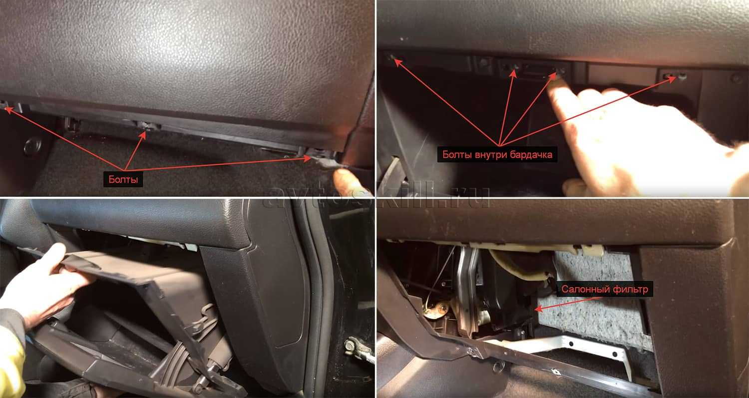 Гораздо сложнее поменять салонный фильтр, установленный где-нибудь под центральной консолью панели приборов. Для этого часто приходится выполнять частичную разборку панели, снимая отделение перчаточника и предназначенную для располагающегося на переднем сидении пассажира фронтальную подушку безопасности.