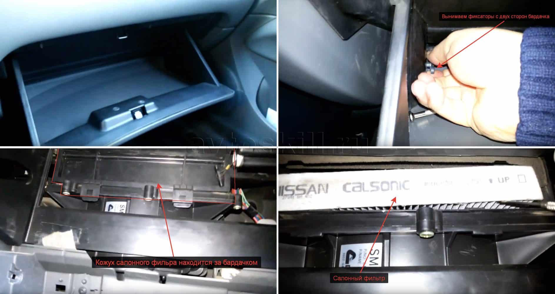 Согласно инструкции на Nissan Juke (2010 г.), для замены СФ снимаются крышка, а затем и сам бардачок. Однако российские умельцы предпочитают обойтись без снятия ящичка, а сдвинув пассажирское кресло, добираются до узла снизу, нажимают и выдергивают крышку. То же самое касается Ниссан Сентра и Nissan Note.