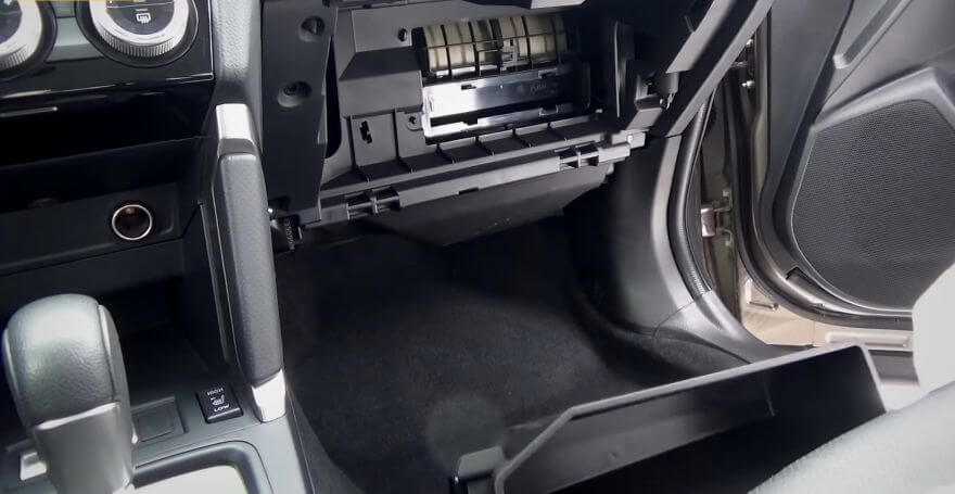 - За бардачком располагается расходник. Извлекается он вместе с рамкой, поскольку такая конструкция у фильтров для Subaru Forester.