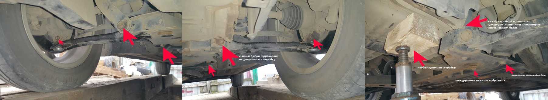 - Передний рычаг крепится шаровой опорой к поворотному кулаку а также двумя болтами к подрамнику. Правая сторона должна открутиться без проблем, а вот водительской стороной не все так просто. Слева мешает открутить болты крепления рычага к подрамнику коробка передач. Для этого потребуется напарник. Берем еще один домкрат и подставляем его под коробку передач. Коробку немного поднимаем и открутить немного боль подрамника, указанный на фото. Ставим монтировку между подрамником и рычагом и вынимаем болты крепления рычага.
