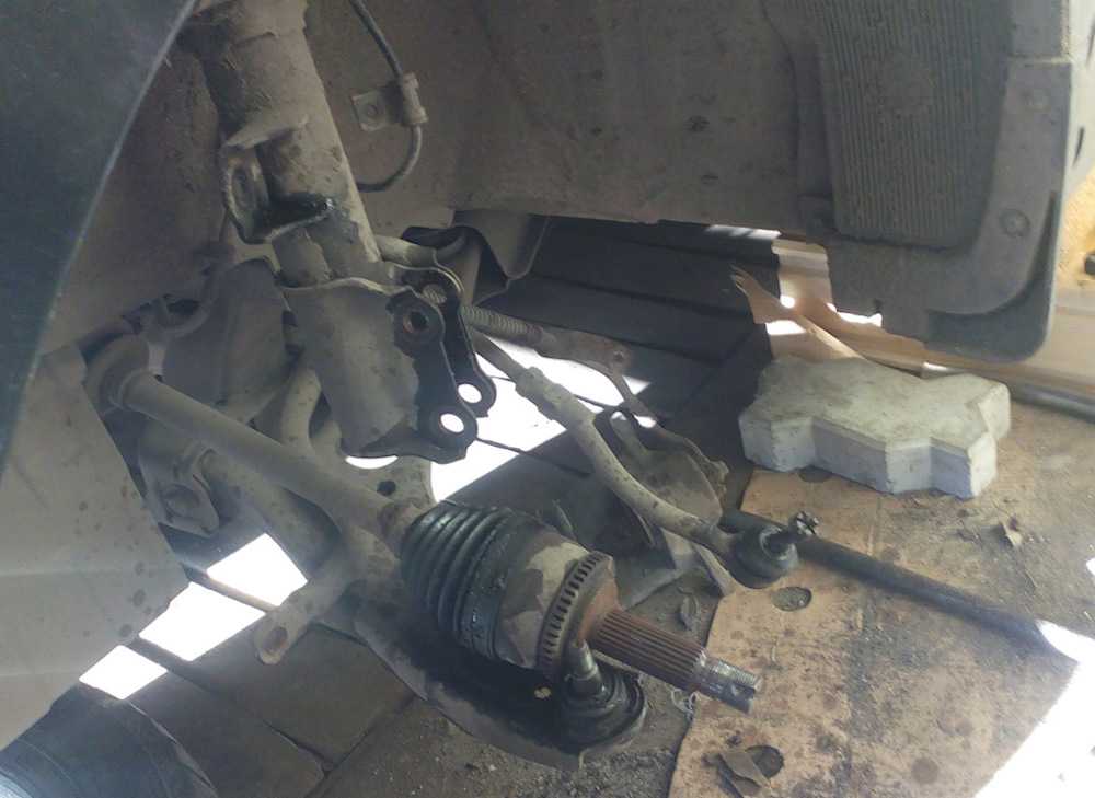 - Чтобы добраться к креплениям шаровой опоры, необходимо выкрутить руль в любую сторону (посмотрите, с какой стороны вам будет удобнее добраться до гаек).