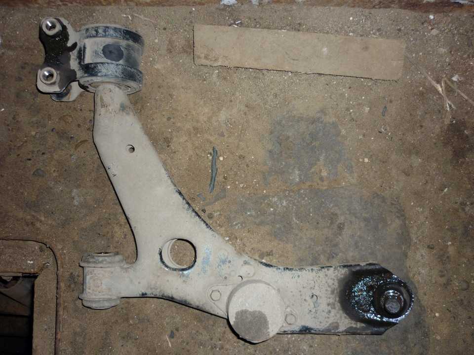 Снимаем рычаг. Для этого ослабляем 3 болта на сайлентблоках, потом болт шаровой, стучим по рычагу, шаровая выходит, откручиваем болты до конца и рычаг наш. Про WD-40 не забываем)