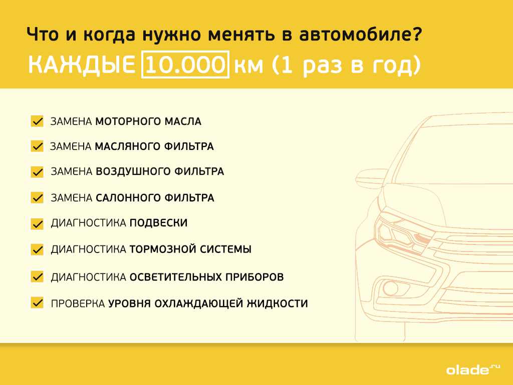 Пробег – это не единственный показатель того, что пора выполнять какие-либо действия. Если за один год вы не «намотали десятку», значит пришло время точно также воспользоваться памяткой. Проще говоря, вы должны обслуживать автомобиль раз в год или каждые 10 000 км. Перечислим все необходимые процедуры технического обслуживания, соответствующие данному пробегу (времени):