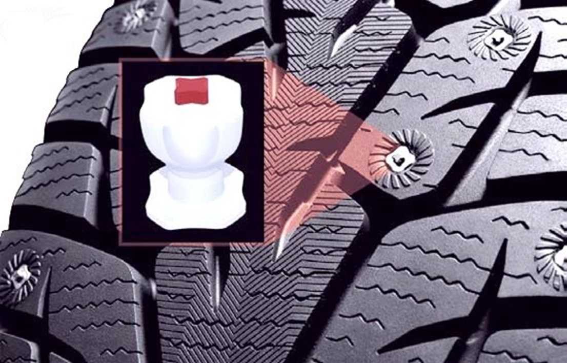 Каждый шип окружен специальными радиальными резиновыми выступами. Они обеспечивают дополнительную фиксацию. предотвращая преждевременное выпадение металлических элементов. Резиновые выступы имеют специальную форму, которая напоминает лопасти ветряной мельницы.
