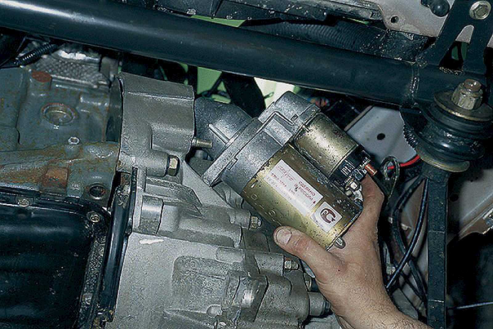 - стартер за корпус отводится в сторону пассажирского сиденья, чтобы бендикс вышел из посадочного места возле маховика;